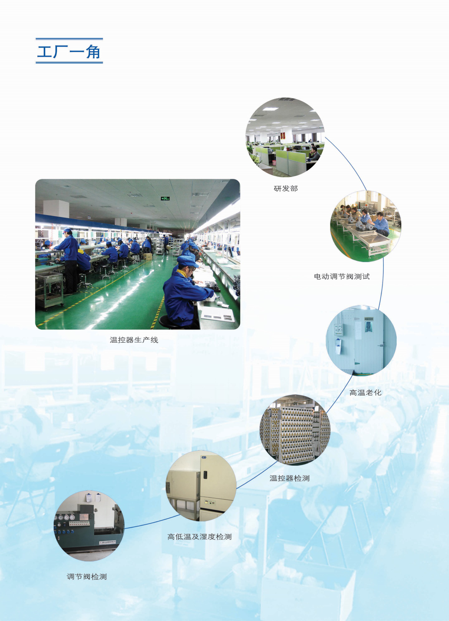 昌平工廠占地39畝,廠房6200平方米,回龍觀研發生產中心占地27畝,廠房14000平方米,年生產能力溫控器170萬只;年生產各類閥的能力50萬只。