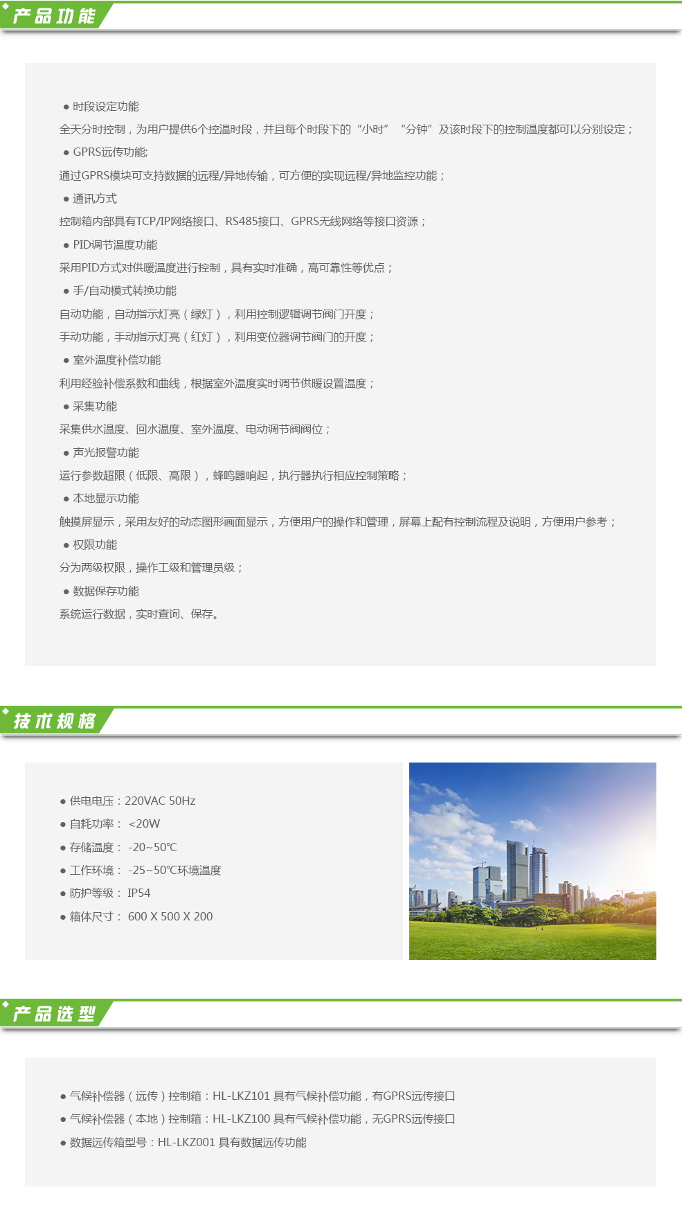 氣候補償器根據室外溫度變化,檢測供水溫度與設定溫度的偏差,通過PI/PID方式輸出DC0-10V信號控制閥門的開度。氣候補償器由于采用連續調節PI/PID控制方式,控制精度最高可達到0.5℃。即通過“量”調節控制,達到“質”調節的目的,最大化的節約能源,克服室外環境溫度變化造成的室內溫度波動,達到節能、舒適的目的。氣候補償器具備時段控制、超溫報警、遠程設定、限位控制等主要功能。主要應用于供熱系統及其他溫控系統,具有高自動化、高效率、高應用性的特點。根據系統的不同,節能率在5-10%之間。
