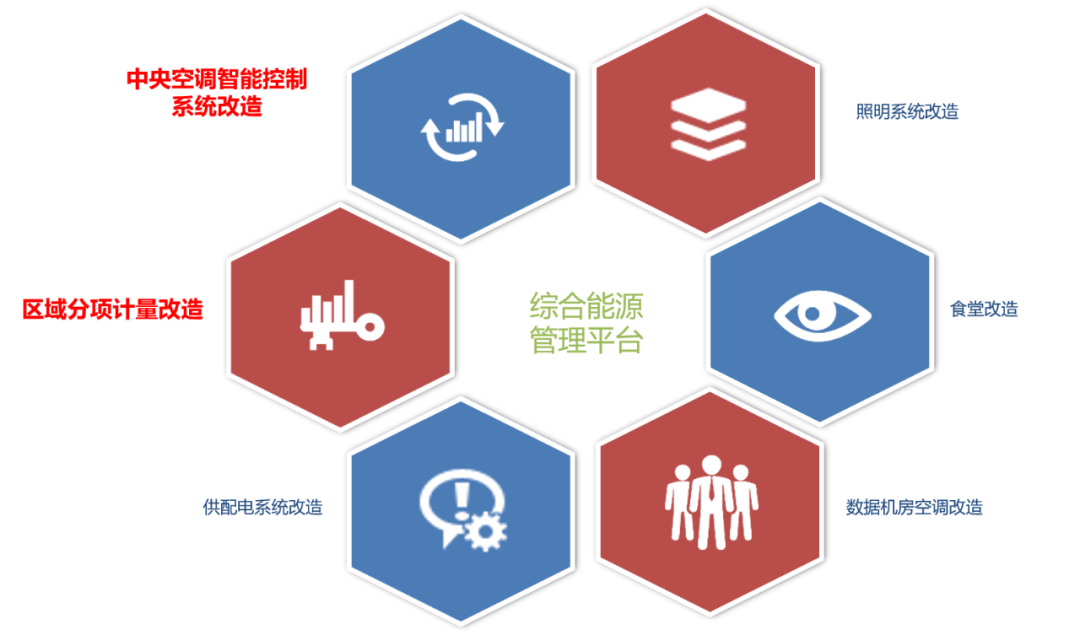 一期E座和二期ABCD座,合計改造面積26.6萬平。分為:水、電、燃氣的分戶分項計量,中央空調的智能控制,智能照明系統,供配電系統智能化監控,食堂改造,數據機房空調改造,綜合能源管理平臺建設等7個部分。