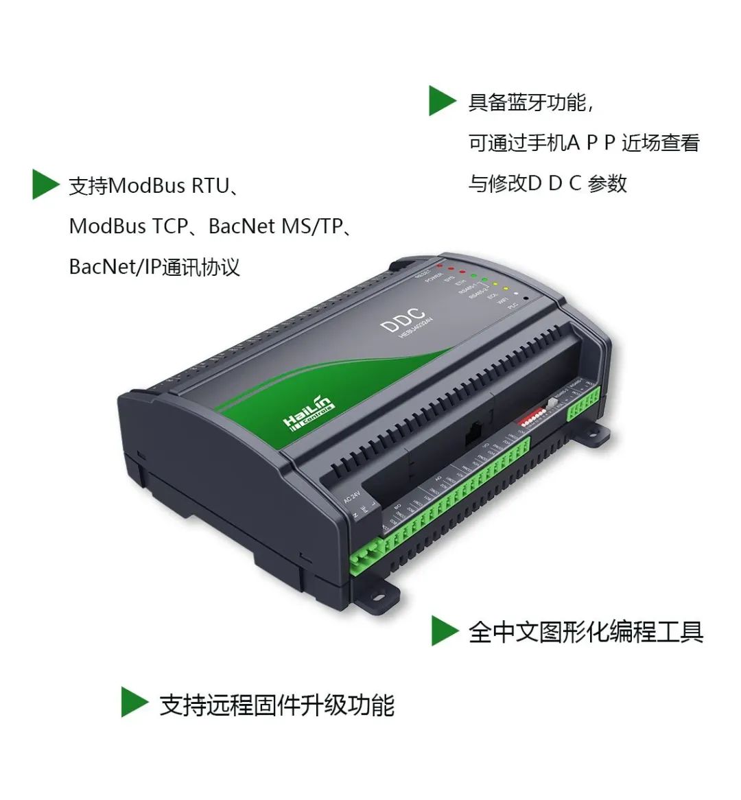 海林自控將物聯網技術融入DDC,加入更多AI算法,使其具備豐富的接口、靈活的組網并支持多種標準通訊協議,可以對樓宇內的冷/熱機組、冷/熱源、空調機組、新風機組、照明和給排水等機電設備的管理控制,實現分散控制,集中管理,為樓宇創造優質的空氣品質的同時,實現節能降耗。