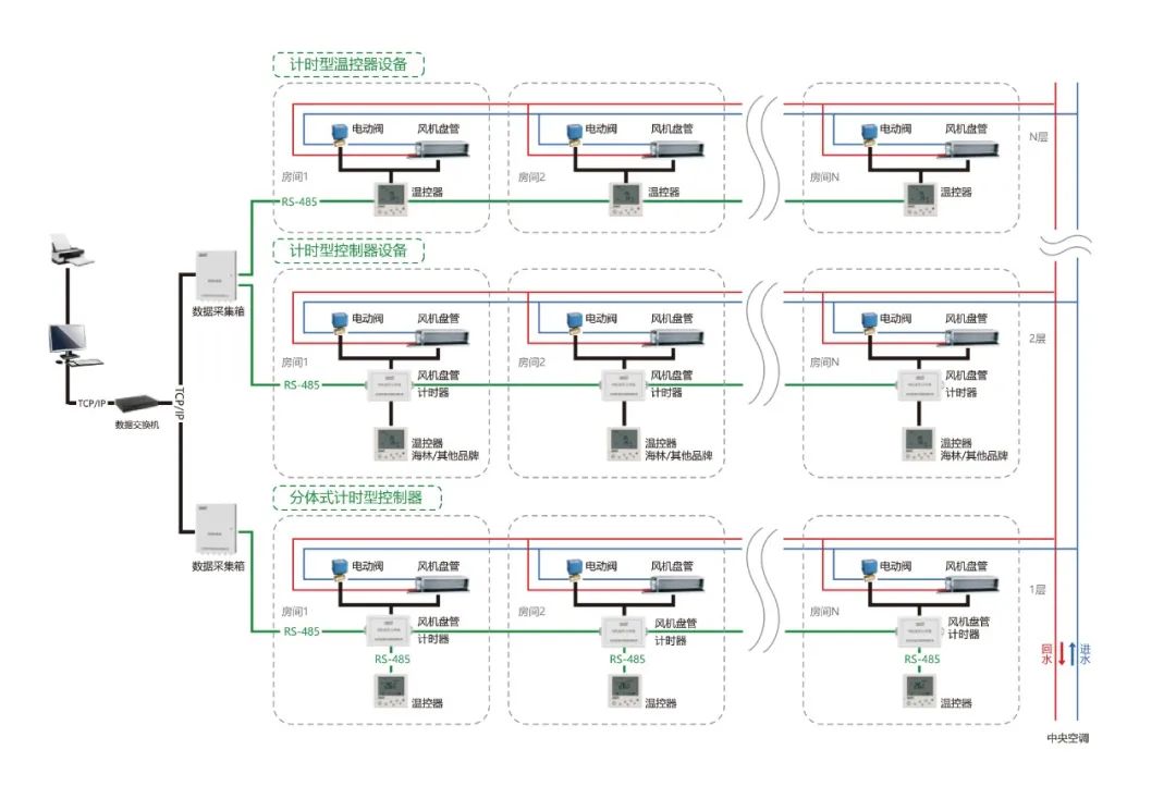 海林HNTS末端溫控器集控系統(tǒng)集自動(dòng)化控制技術(shù)、計(jì)算機(jī)網(wǎng)絡(luò)技術(shù)于一體,可同時(shí)集中或獨(dú)立對(duì)多臺(tái)末端設(shè)備的啟停、水閥的開(kāi)閉及溫度設(shè)置進(jìn)行控制。有三種聯(lián)網(wǎng)集控方式:RS-485 有線方式、 LoRa 無(wú)線方式和 Wi-Fi 無(wú)線方式。