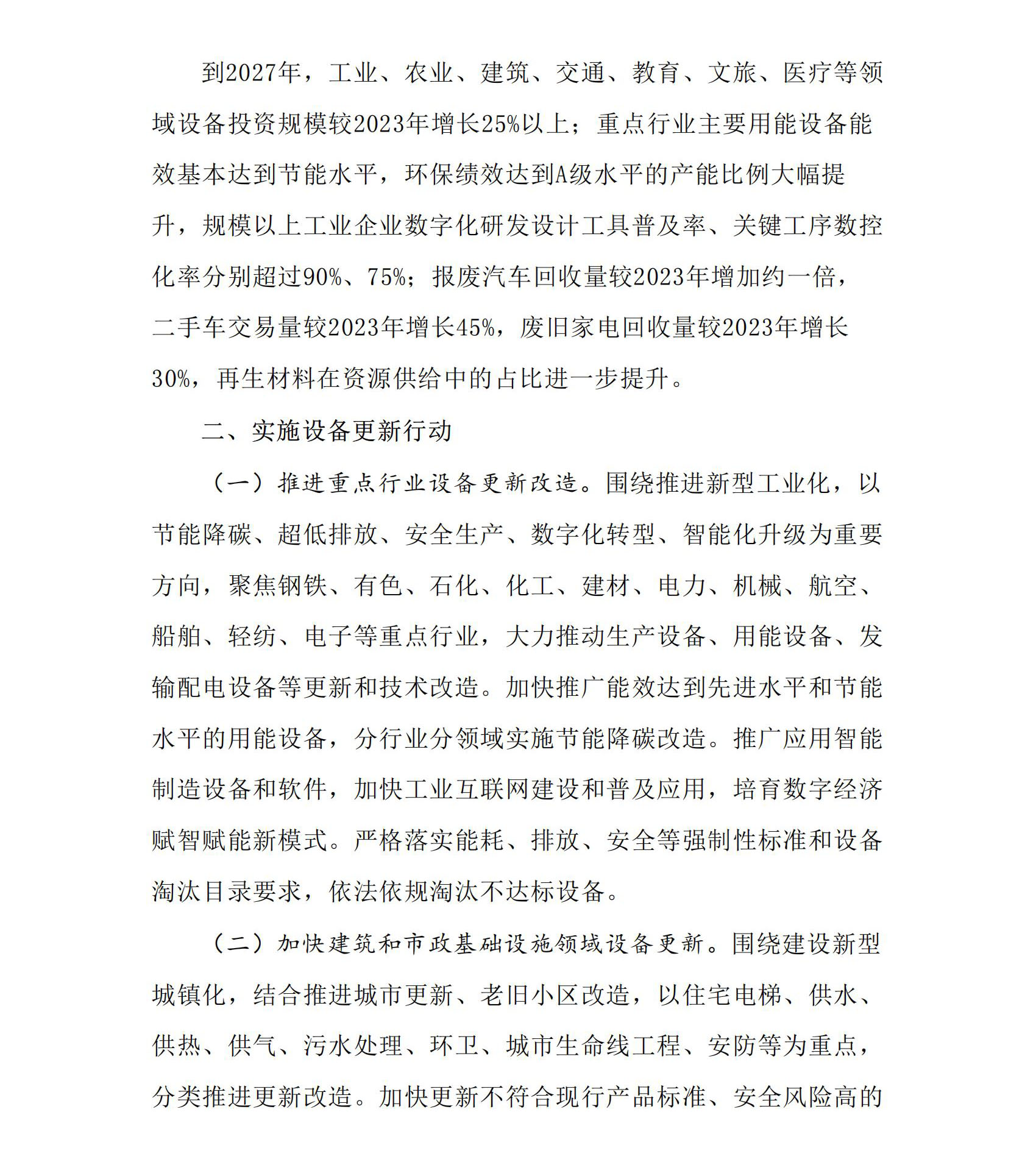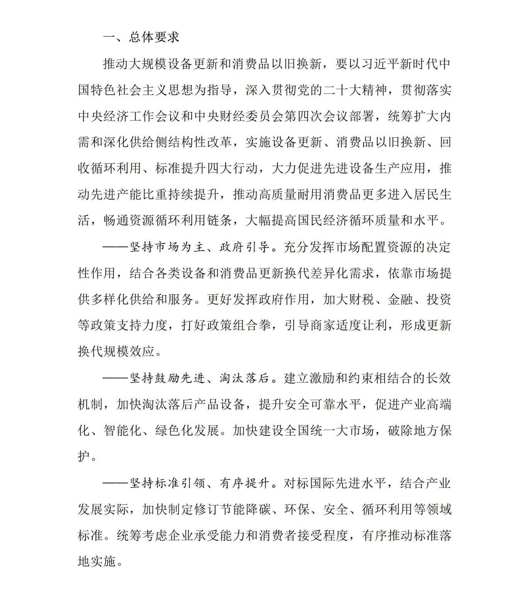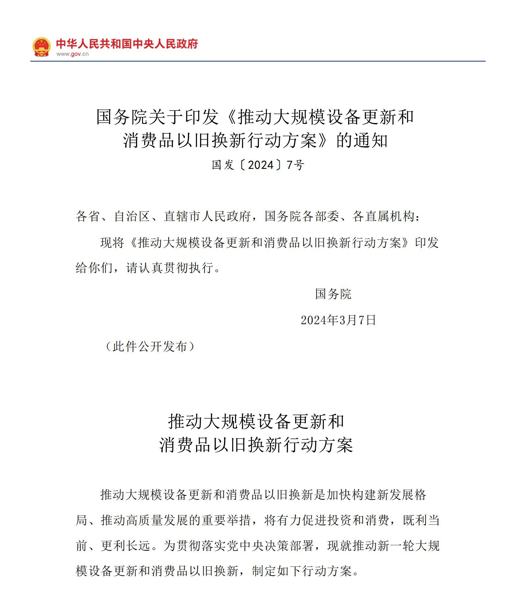 3月13日晚間,國務院正式印發《推動大規模設備更新和消費品以舊換新行動方案》。