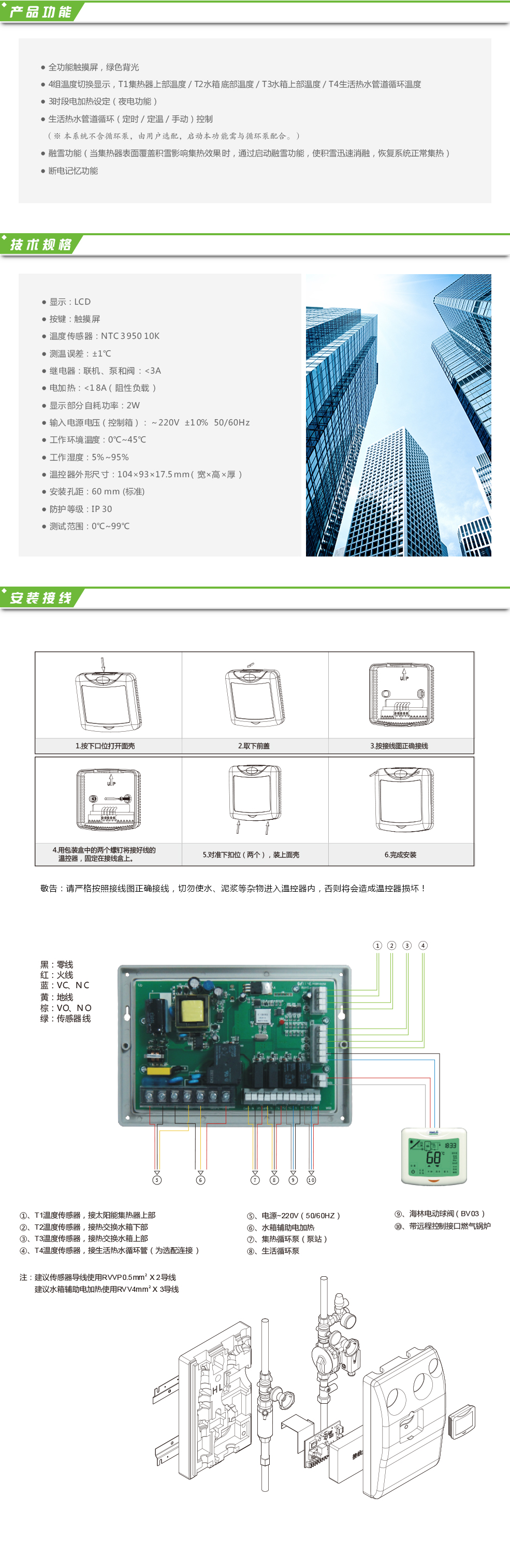 HS2018分體式太陽能熱水器控制器應用于太陽能熱水系統的智能化監控與管理。采用綠色背光,液晶觸摸屏,控制主板與控制面板分離式設計,并通過溫差和實時通訊,來控制太陽能集熱器端與水箱端熱交換循環泵、用戶端生活熱水循環泵和定時啟動輔助電加熱等設備,以實現系統自動運行,方便用戶使用的目的。