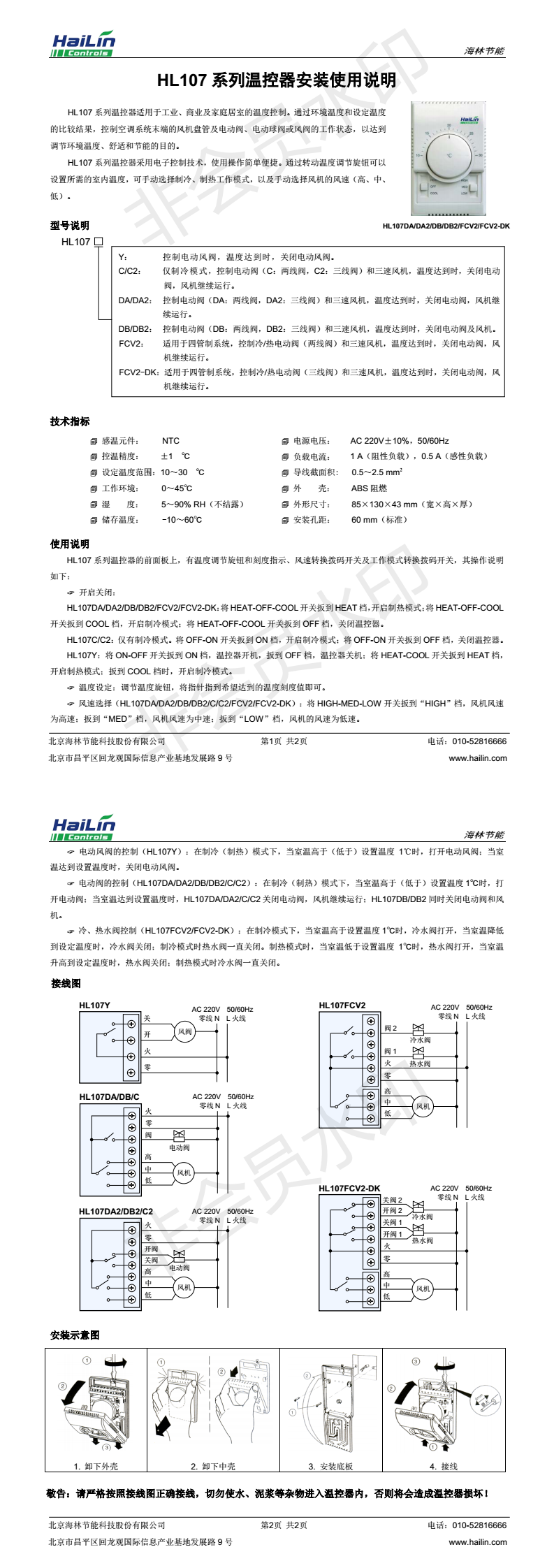 HL107 系列溫控器采用電子控制技術, 使用操作簡單便捷。通過轉動溫度調節旋鈕可以 設置所需的室內溫度,可手動選擇制冷、制熱工作模式,以及手動選擇風機的風速(高、中、 低)。