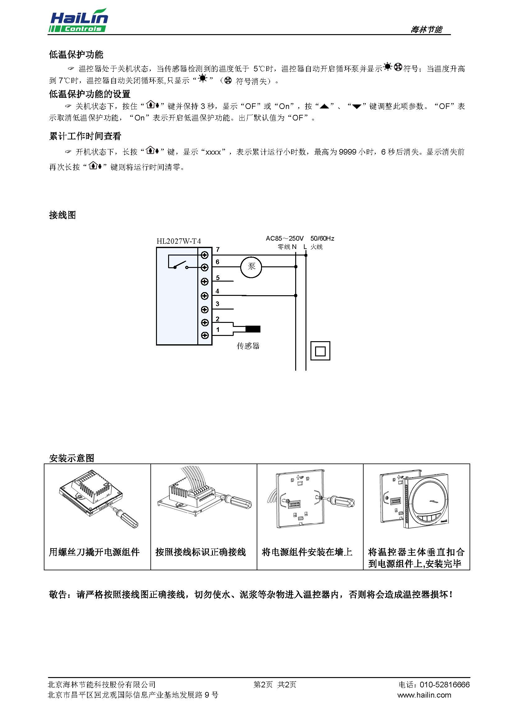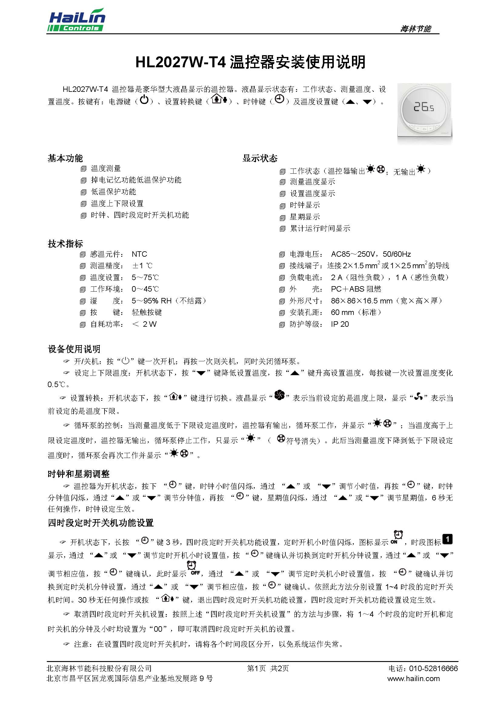 HL2027W-T4 溫控器是豪華型大液晶顯示的溫控器。液晶顯示狀態有:工作狀態、測量溫度、設 置溫度。