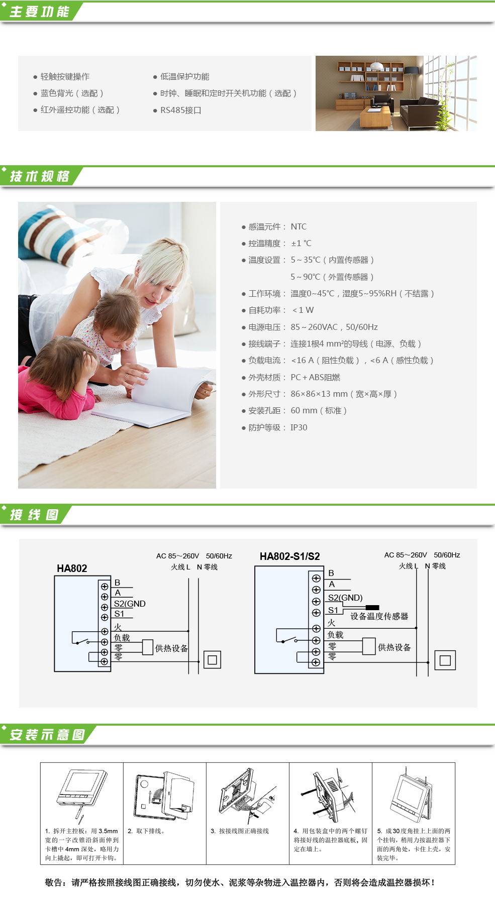 網絡型溫控器HA802-MD是適用于電采暖系統的采暖溫控器,用于家庭、辦公樓、寫字樓、學校等場所。通過控制發熱電纜或電熱膜的通電、斷電,達到調節室內溫度的作用,同時具備低溫保護功能??赏ㄟ^網絡(MODBUS 協議)實現遠程數據采集和集中控制。