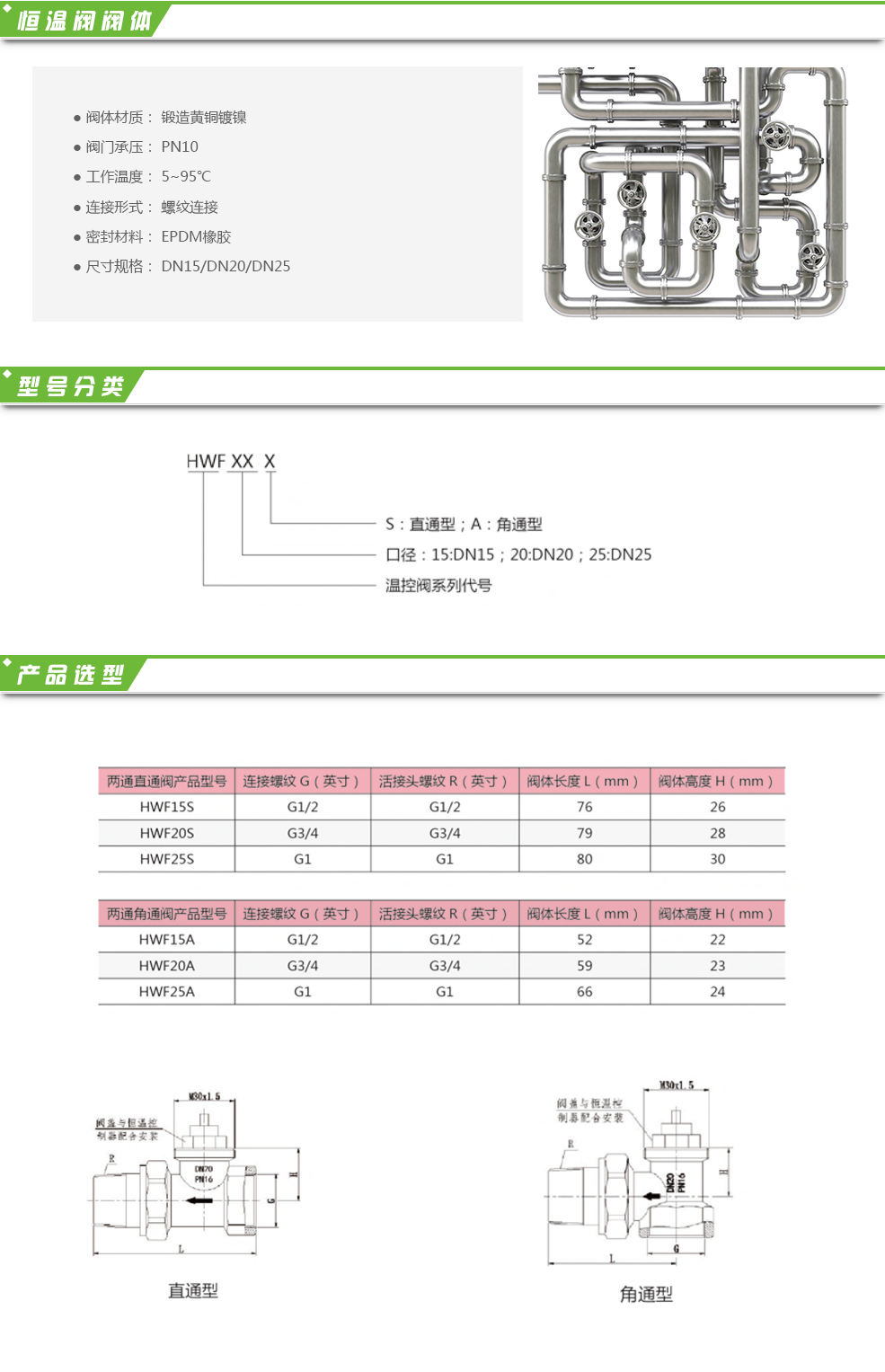 恒溫閥HWF是安裝在散熱器上的自動控制閥門。與控制器T36配套使用能夠自動感知環(huán)境溫度,并在不通過外力的情況下進一步調(diào)節(jié)閥開度,控制水流的大小,進而維持房間溫度在設(shè)定溫度。海林溫控閥嚴格按照歐盟標準EN215進行生產(chǎn),設(shè)計精巧,控溫精確,可滿足各種管網(wǎng)結(jié)構(gòu)的應(yīng)用。