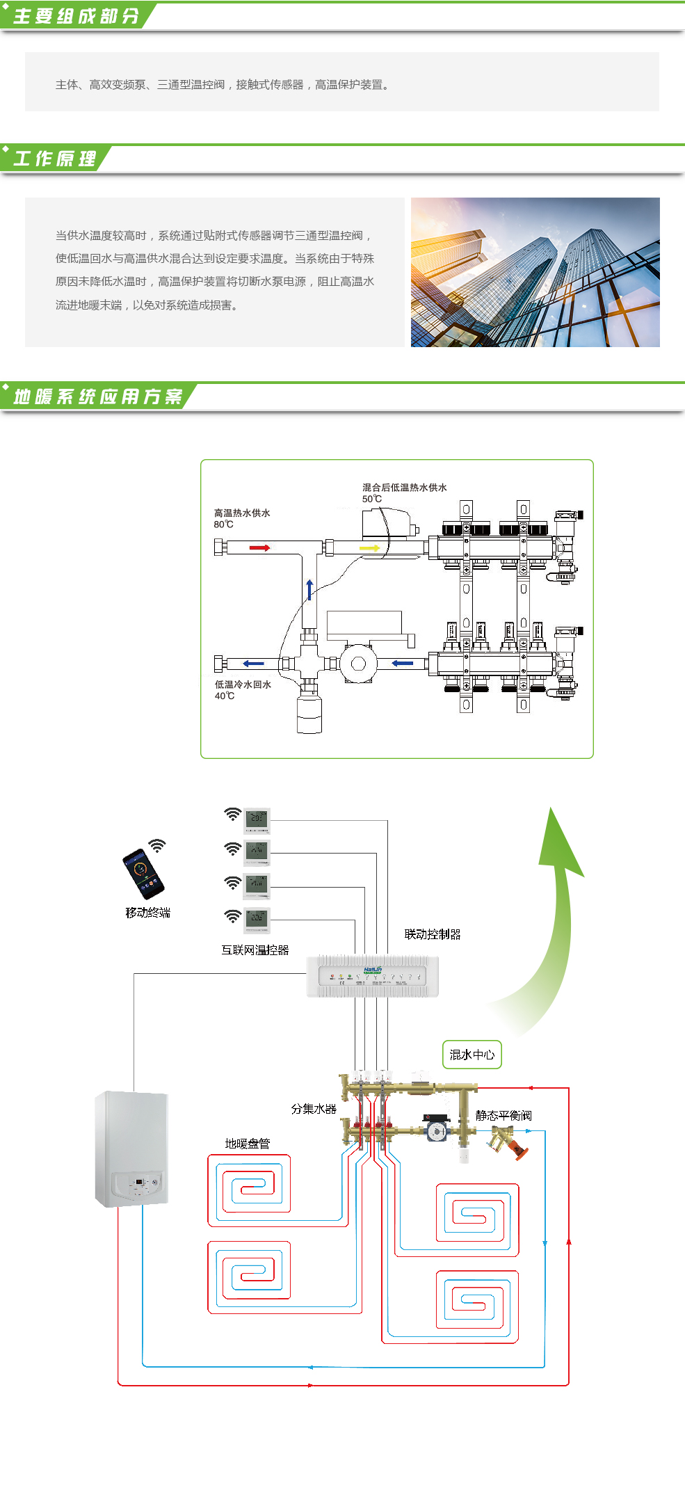 E2505型混水中心是將末端地暖高溫供水降低溫度。例如在改造項目中,采暖末端散熱器與地暖同時存在,熱源供水溫度較高的系統中,將高溫供水與低溫回水混合,通過傳感器與溫控閥調節混合比例,達到降低供水溫度目的。