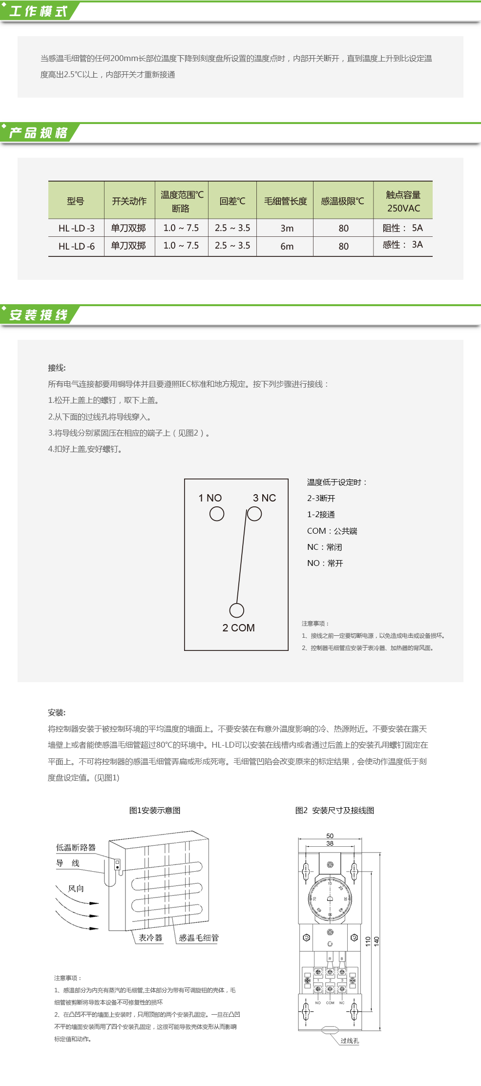 HL-LD低溫斷路控制器工作于單刀雙擲模式。典型應用包括:低溫條件下用于保護熱交換器、表冷器以及液體工作管路為避免過冷或結冰。當感溫毛細管的任何200mm長部位溫度下降到刻度盤所設置的溫度點時,內部開關斷開,直到溫度上升到比設定溫度高出2.5℃以上,內部開關才重新接通。