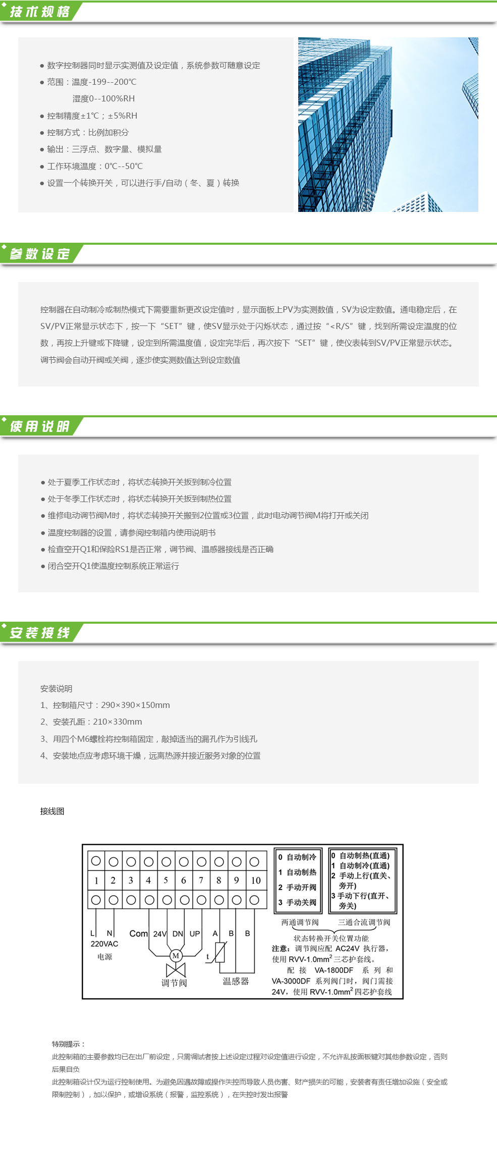 HL-KZ1201系列溫度控制箱內配裝CH402系列鋰化表控制器,用于水管道或風系統的控制。通過對檢測參數與箱內控制器上用戶設定的參數相比較、判斷,來控制電動調節閥,達到水溫式室溫的自動調節。